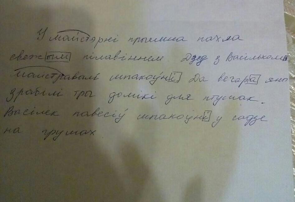 У майстэрні прыемна пахла(свежае) пілавіннем. Дзед з (Васілёк) майстравалі шпакоўні. Да(вечар) яны зрабілі тры домікі для птушак. Васілёк павесіў (шпакоўня) у садзе на грушах.