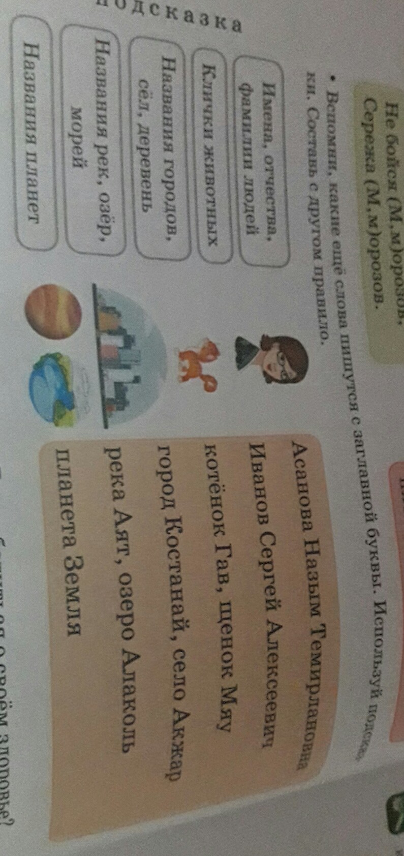 Имена, Отчества, фамилии людей Асанова Назым Темирлановна. Клички животных, котёнок Гав. Названия городов,сёл, деревень город Костанай, село Акжар, река Аят. Названия планет, планета Земля, всё это имена собственные, имена собственные это предметы у которых названия одно на всю планету, к примеру река Волга, она одна во всей планете.