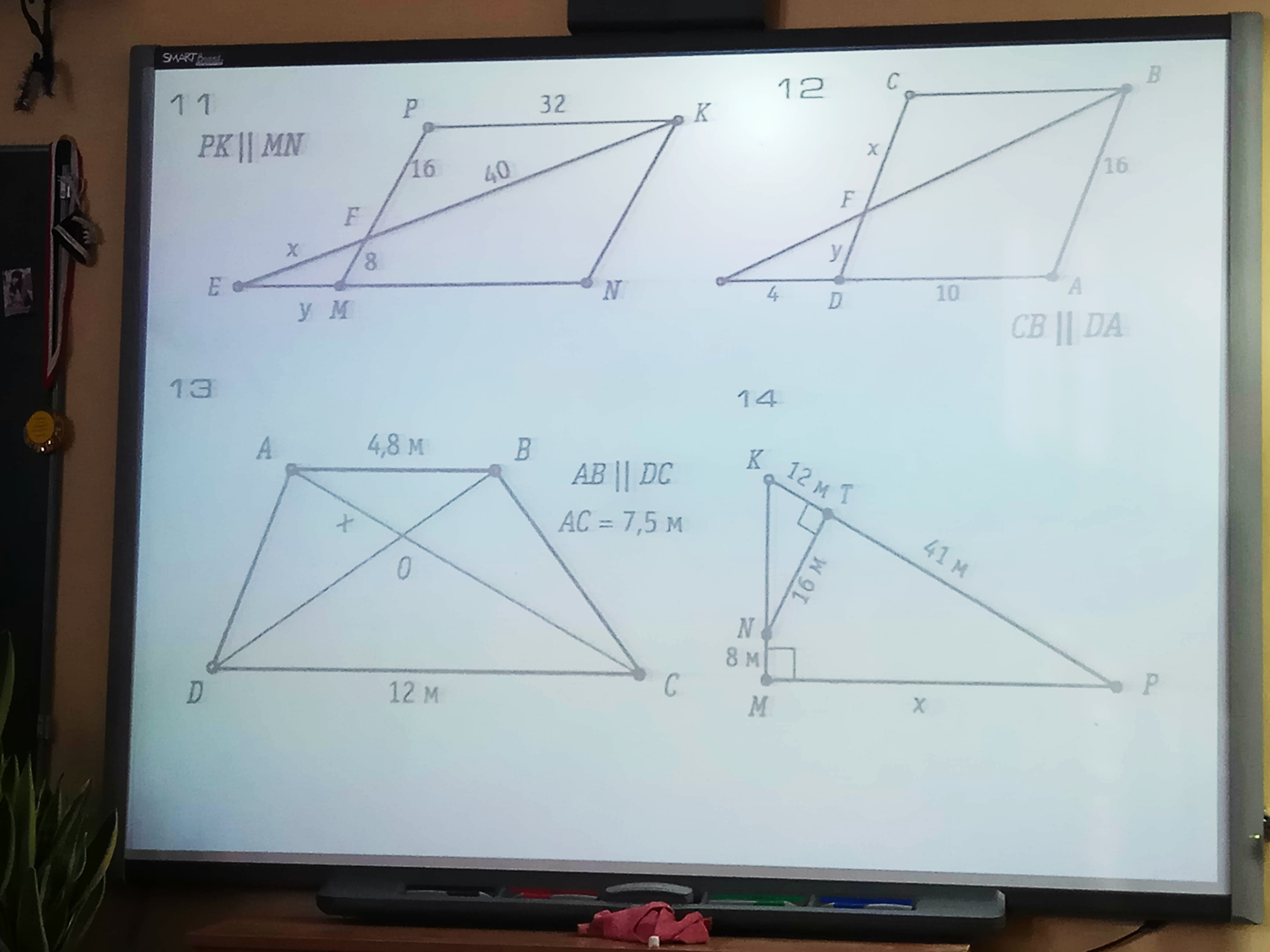 Первая фигура: ΔEMF подобен ΔKPF по первому признаку ( по двум углам, а именно KPF равен EMF (внутр. накрест лежащие), PFK равен EFM (как вертикальные).x=20 y=16 (из-за подобия треугольников ΔEMF и ΔKPF) Т.е. EM/KP=EF/KF=FK/FM=коэффициенту подобия.