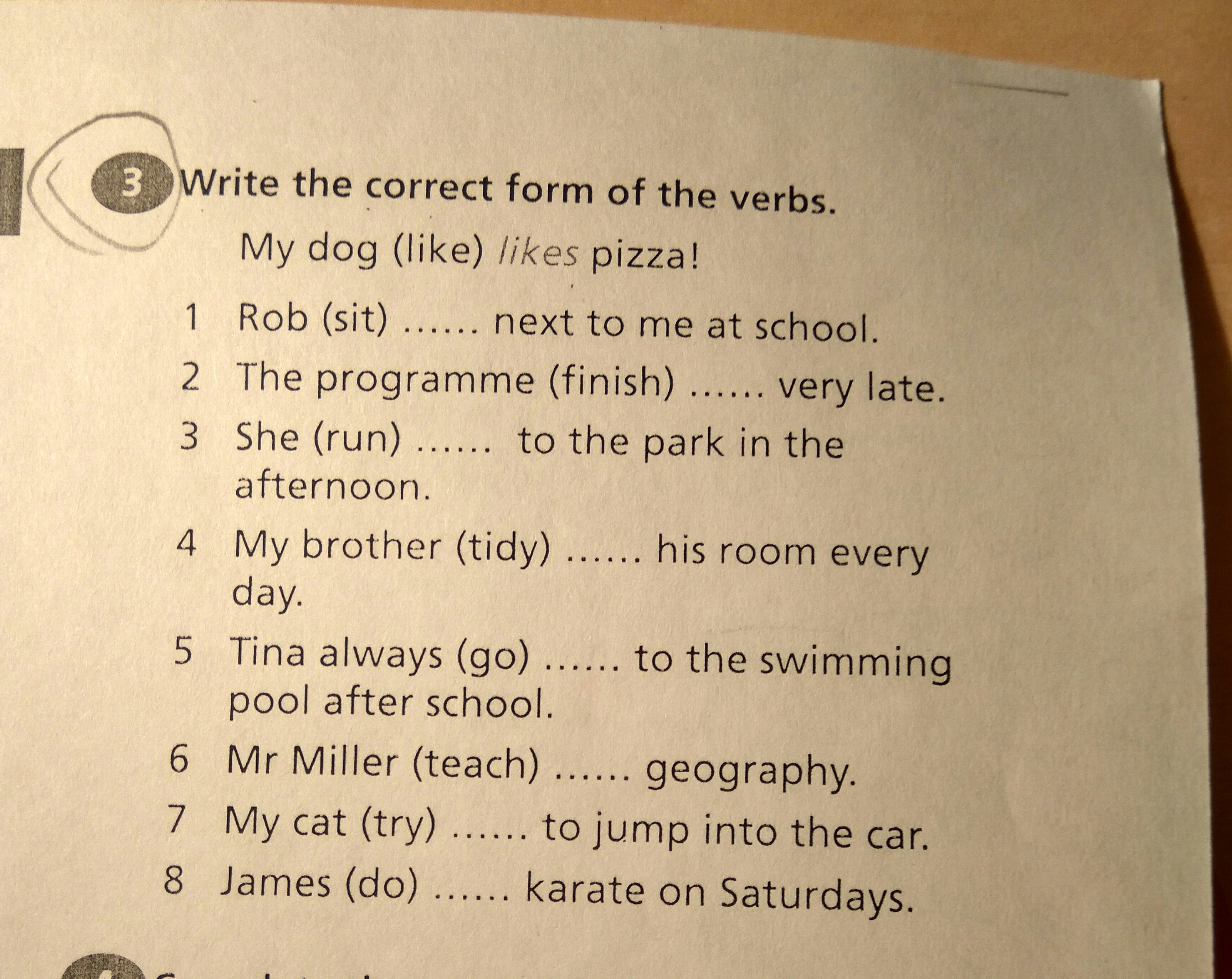 1sits2 finishes3runs4 tidies5goes6teaches7tries8does