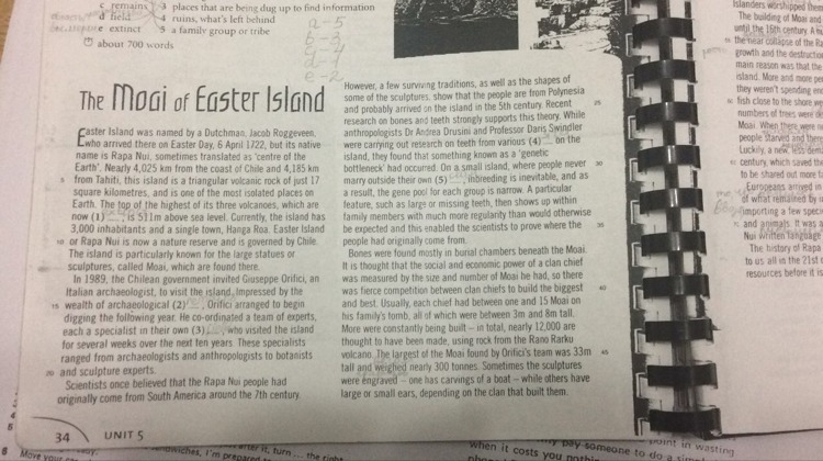 Остров астры был назван голландец Якоб Роггевин. который прибыл туда в День Пасхи 6 апреля 1722 года, но его родным именем является Рапа Нуи, иногда переводящийся как центр Земли ». Около 4 025 км от побережья Чили и в 4185 км от Таити этот остров представляет собой треугольную вулканическую породу всего в 17 квадратных километров и является одним из самых изолированных мест на Земле. Верхняя часть самого высокого из трех ее вулканов, которые теперь (1), составляет 511 м над уровнем моря, в настоящее время на острове проживает 3000 жителей и один город, Ханга-Роа-Пас-Пас-лас-сас или Рапа-Нуи теперь является заповедником и управляется Чили Остров особенно известен большими статуями или скульптурами, которые называются Моаи, которые находятся там. В 1989 году правительство Чили пригласило итальянского археолога Гусеппе 0rifici. чтобы посетить остров, придуманный богатством археологических раскопок (2), которые начали копать в следующем году. Он координировал команду экспертов, каждый из которых специализировался в своем (3) H, который посетил остров в течение нескольких недель следующие десять лет. Эти специалисты варьировались от археологов и антропологов до ботаников и экспертов по скульптуре. Ученые когда-то считали, что люди Рапа Нуи изначально пришли из Южной Америки в X веке