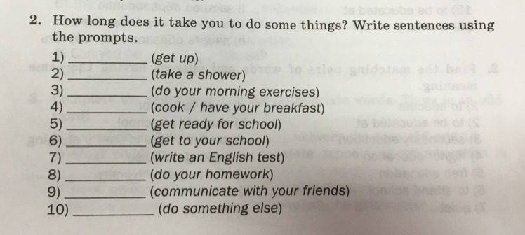 I get up at seven o'clock. After that I take a shower which take me ten minutes. After I do my morning exercises twenty minutes. I cook my breakfast, it takes me fifteen minutes. After I get ready to school about five minutes. I get to school at half past eight. Than I write an English test about forty five minutes. After I go home and do my homework. It usually takes me one hour. When I do all my home exercises I often communicate with my friend at seven pm. And if I have a free time a always do something else . ( как-то так чел)