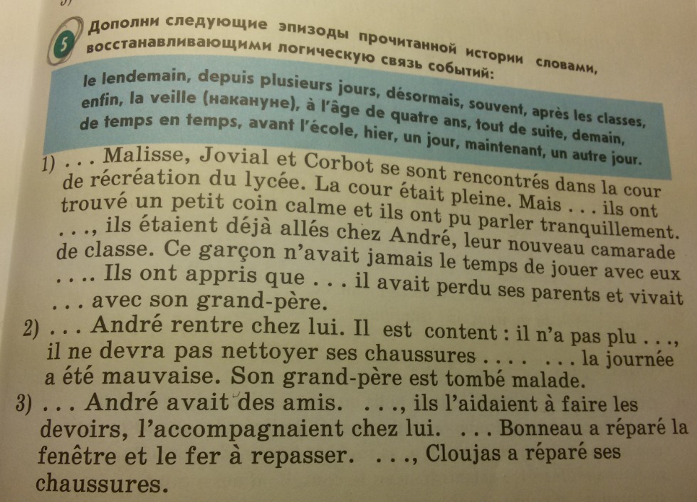 Malisse, Jovial и встретились во дворе, где один из дворов был. Но у них был тихий маленький уголок, и они могли спокойно разговаривать. уже отправились к Андре, их Се никогда не успевали поиграть с ними. Они узнали, что он потерял своих родителей и жил со своим дедом. Андре идет домой. Он рад, что он не дождется, ему не придется чистить ботинки, день был плохим. Дед заболел. 3) У Андре были друзья. помог ему с домашним заданием, сопроводил его к себе домой. Боннео отремонтировал окно, а железные клоусы отремонтировали его