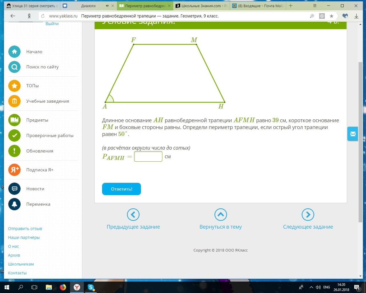 Длинное основание AH равнобедренной трапеции AFMH равно 39 см, короткое основание FM и боковые стороны равны. Определи периметр трапеции, если острый угол трапеции равен 50°.