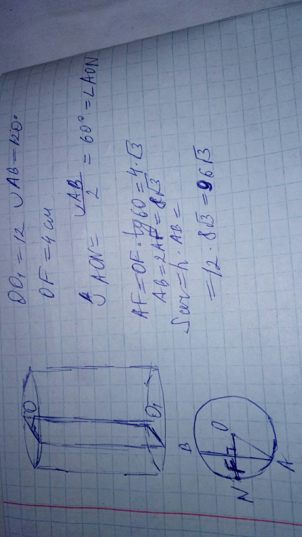 В цилиндре параллельно оси проведена плоскость, отсекающая от окружности основания дугу в 120 градусов. Длина оси 12 см, ее расстояние от секущей плоскости 4 см. Вычислить площадь сечения