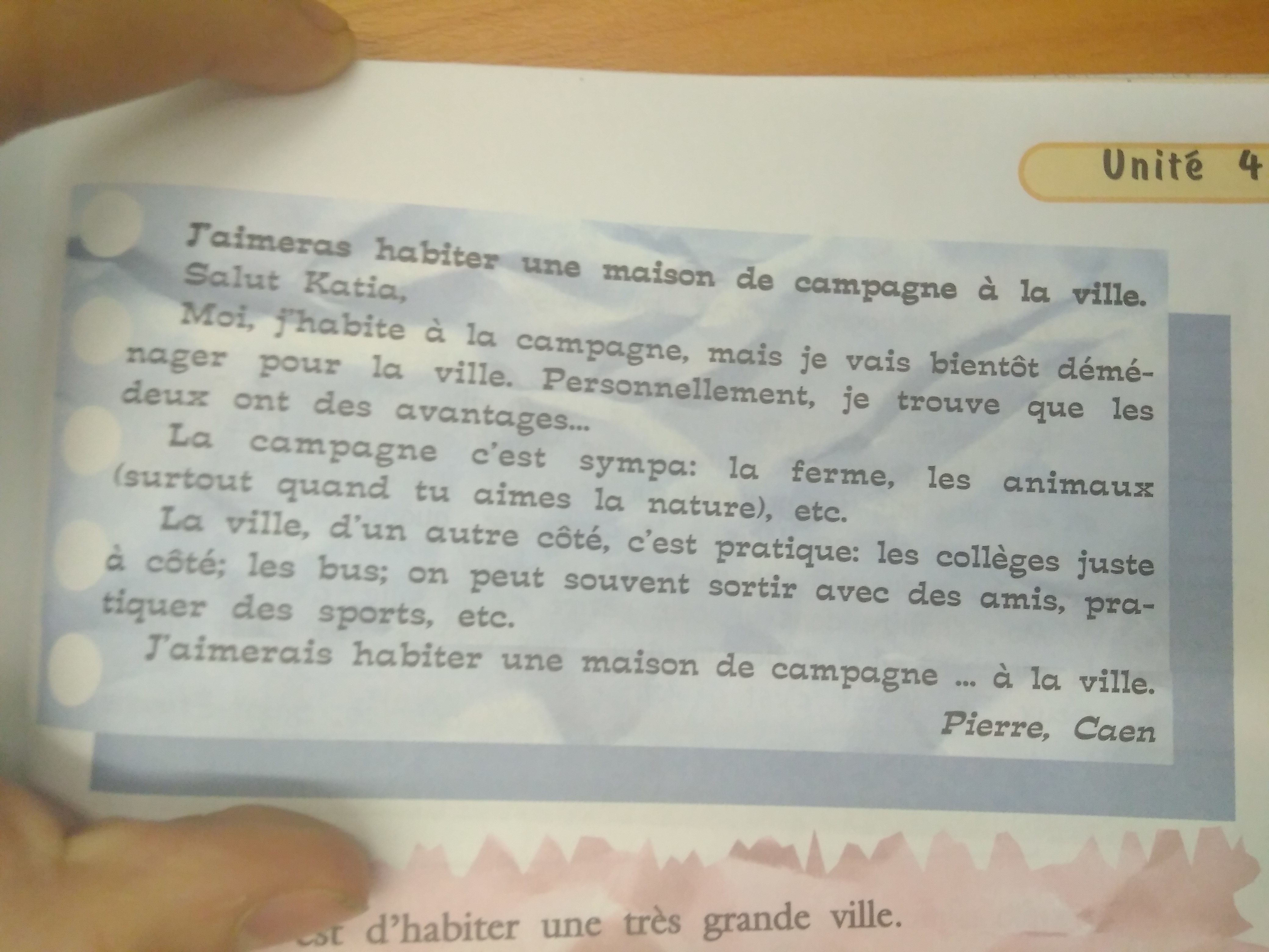 Я хотел бы жить в загородном доме в городе.Привет, Катя.Я живу в сельской местности, но скоро перееду в город. Лично я считаю, что оба имеют преимущества.Сельская местность хороша: ферма, животные (особенно, когда вы любите природу) и т. д.Город, с другой стороны, удобен: колледжи по соседству; автобусы, мы часто можем встречаться с друзьями, заниматься спортом и т. д.Я хотел бы жить в загородном доме ... в городе.