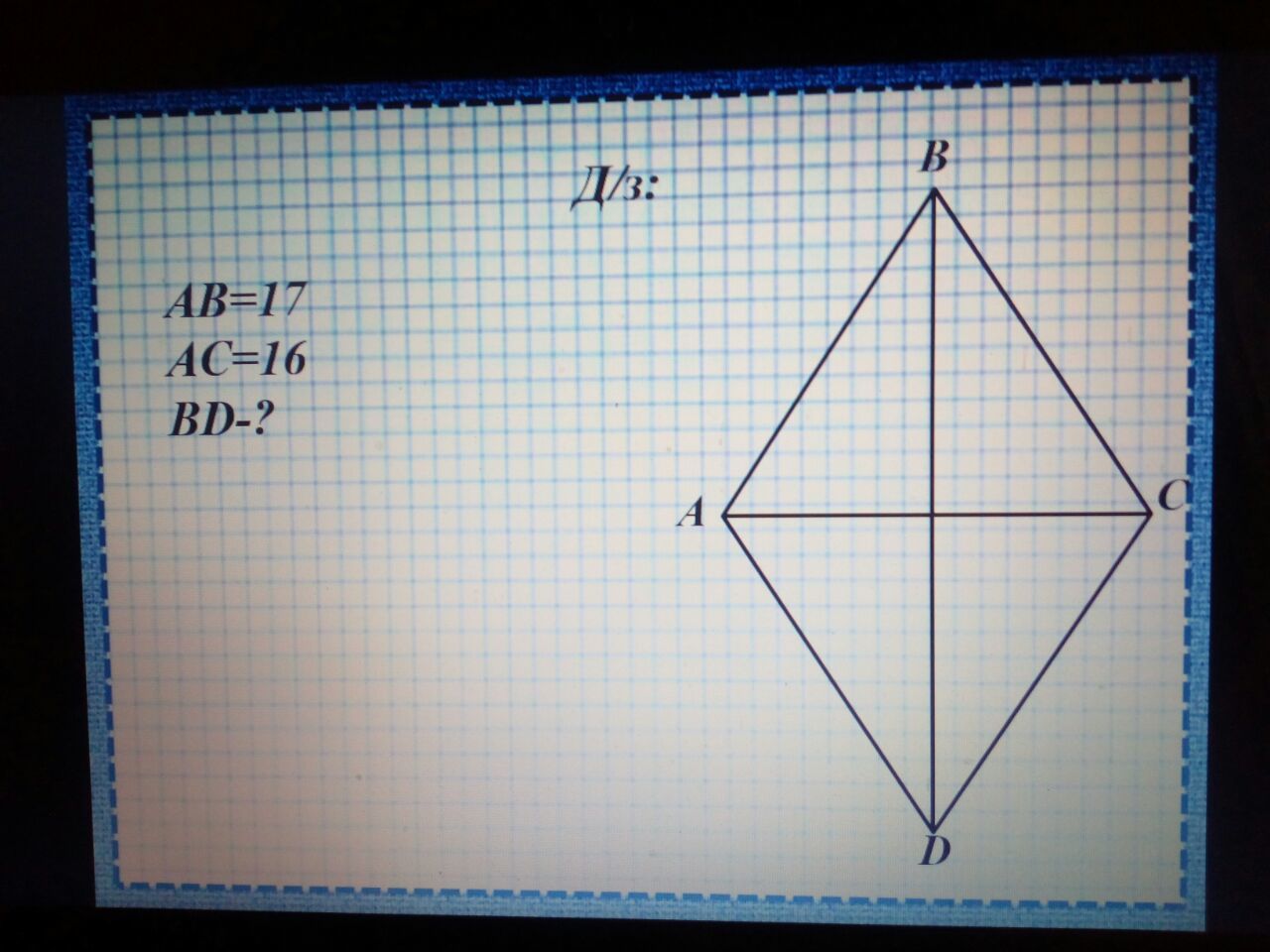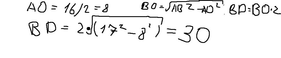 0-это центр АО= АС/2 по теореме пифагора нашёл сторону ВО , потом