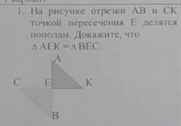 На рисунке отрезки AB и CK точкой пересечения E делятся пополам.Докажите что треугольник AEK=треугольника BEC