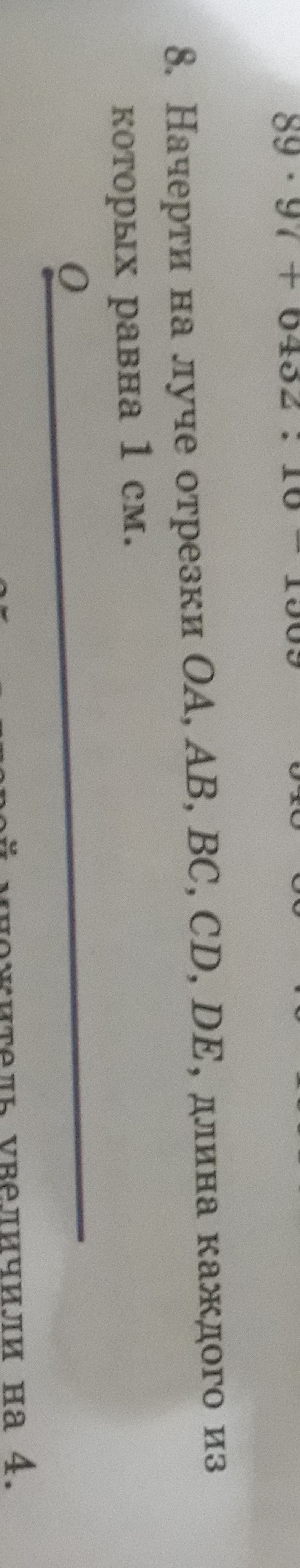 Отступаешь 1 см от точки O и ставишь точку A на луче. отступаешь 1 см и ставишь точку B на луче. Отступаешь 1 см и ставишь точку C на луче. Отступаешь 1 см и ставишь точку D на луче. Отступаешь 1 см и ставишь точку E. на луче.