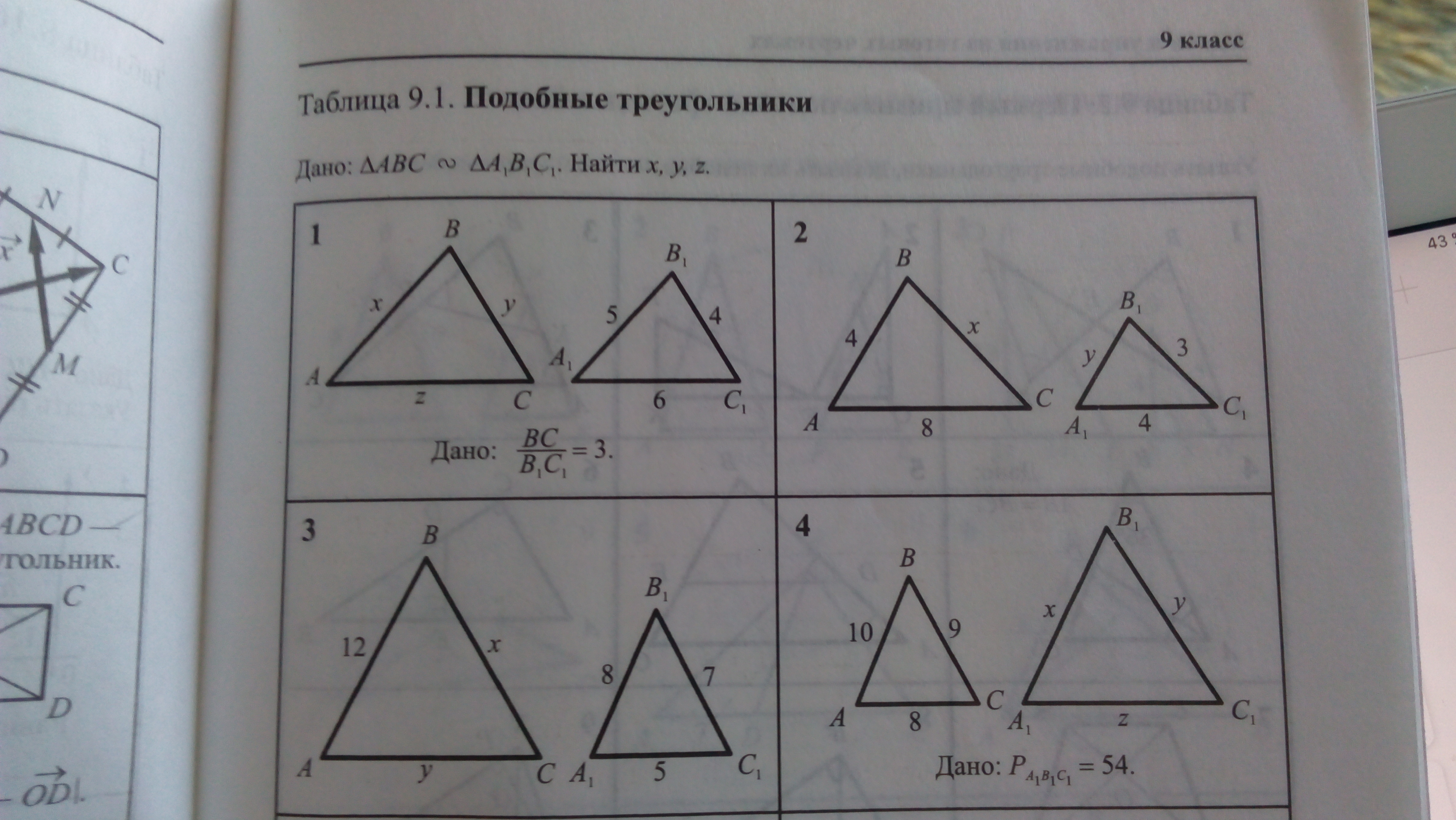 1. Дано условие, что ВС/В1С1=3. Следовательно, каждая сторона первого треугольника больше соответствующей стороны второго треугольника в 3 раза. Ищем стороны: