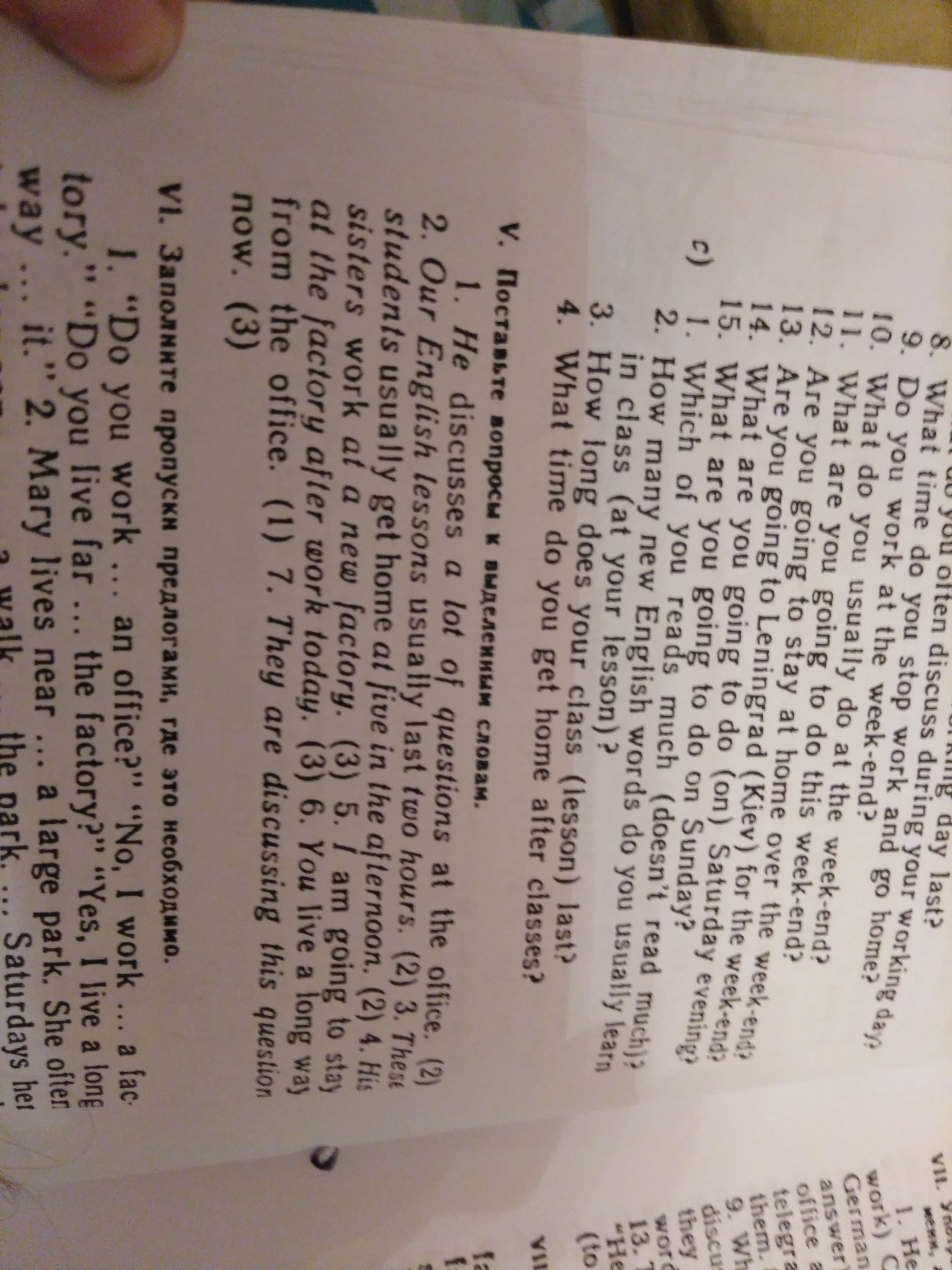 1) Who discusses a lot of questions at the office? What does he discuss at the office?