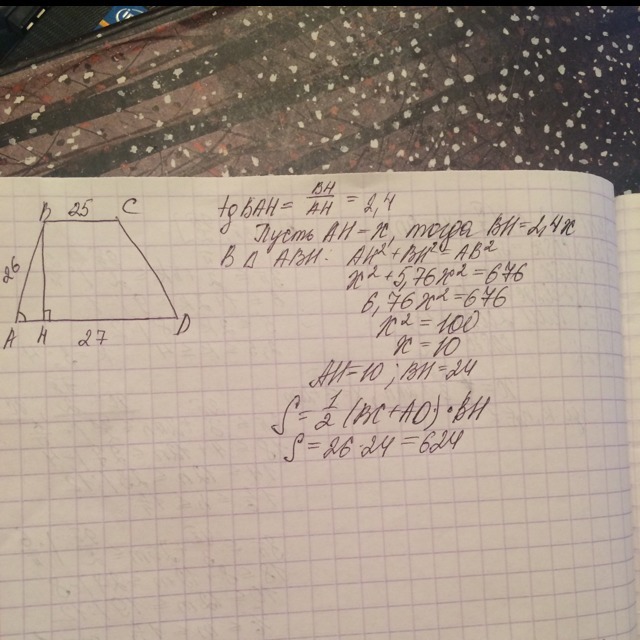 Основания трапеции равны 25 и 27, одна из боковых сторон равна 26, а тангенс угла между этой стороной и одним из оснований равен 2,4. Найдите площадь этой трапеции.