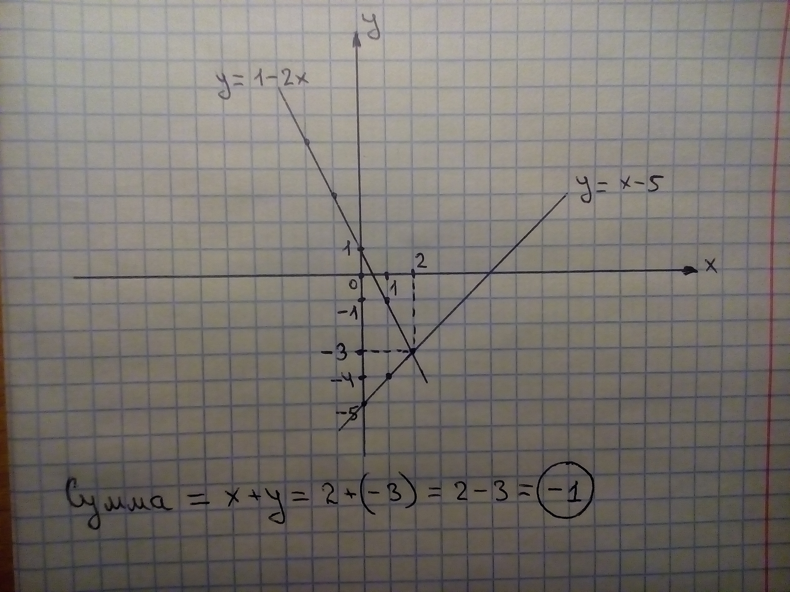выполняя построения вычислите сумму абсцисса и ордината точки пересечения графиков функции у=1-2х и у=х-5