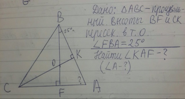Треугольник ABC - произвольный Высоты BF и CK пересекаются в точке O. Угол FBA= 25 градусов. Найти угол KAF