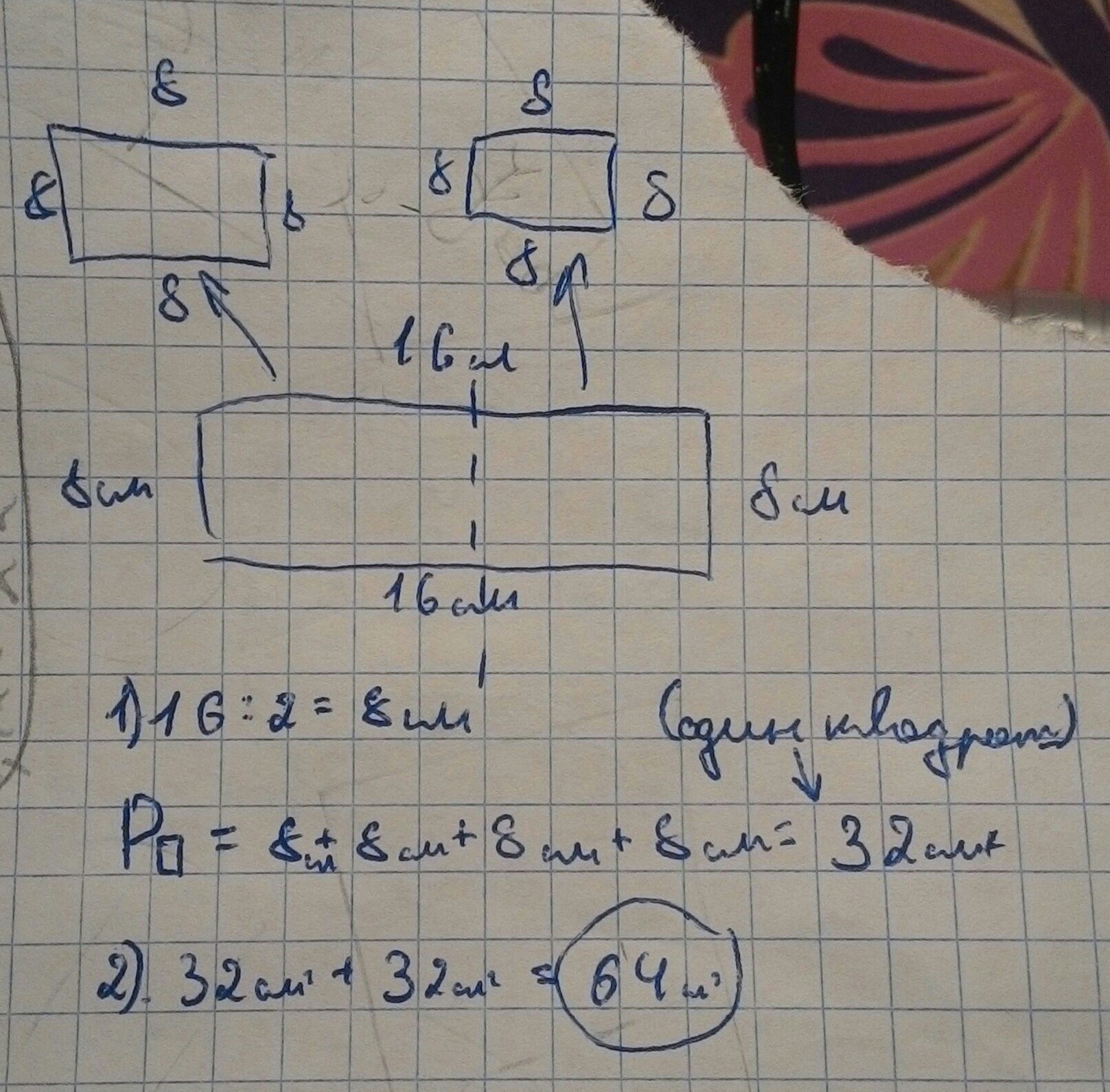 Прямоугольник длины сторон которого равны 8 см и 16 см разрезали на два квадрата Чему равна сумма периметров получившихся квадратов
