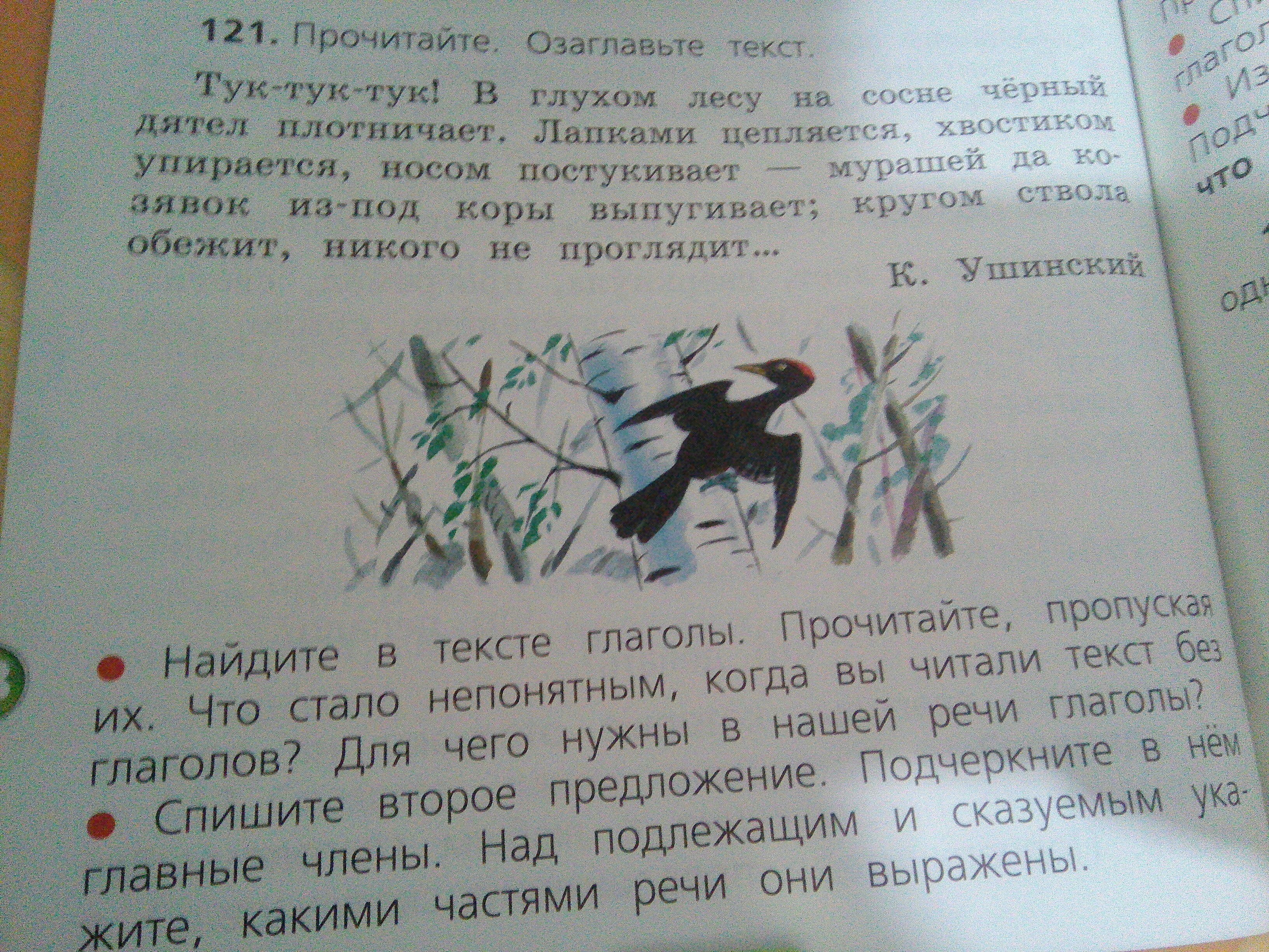 3) главные члены это подлежащее(существительное) - «дятел» (подчеркнуть одной чертой), сказуемое(глагол) - «плотничает»(подчеркнуть 2-мя чертами)