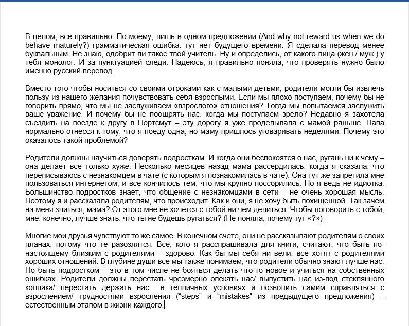 Вместо того, чтобы суетиться вокруг своих подростков, как около маленьких детей, родители могли бы использовать наше желание почувствовать себя взрослыми в своих интересах. Если мы ведем себя плохо, почему бы не сказать нам прямо о том, что мы не заслуживаем того, чтобы нас рассматривали как взрослых людей? Тогда мы попытаемся заслужить ваше уважение. И почему бы не вознаградить нас, когда мы будем вести себя зрело? Недавно, я хотела сесть на поезд в Портсмут, чтобы увидеть друга – путешествие, которое я сделал с мамой раньше. Папа прекрасно отнесся к идеи, что я поеду одна, но для того, чтобы согласилась мама, потребовались недели доводов. Почему это было таким важным делом?