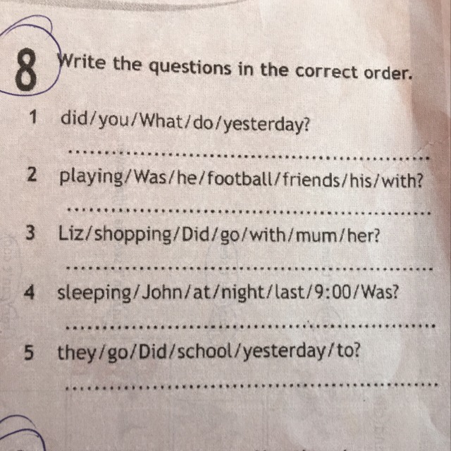 what did you do yesterday 2Was he playing wiht his friends 3Did Liz go shopping with her mum4 was john slepping at last night 9:00 5 did they go to school yesterday
