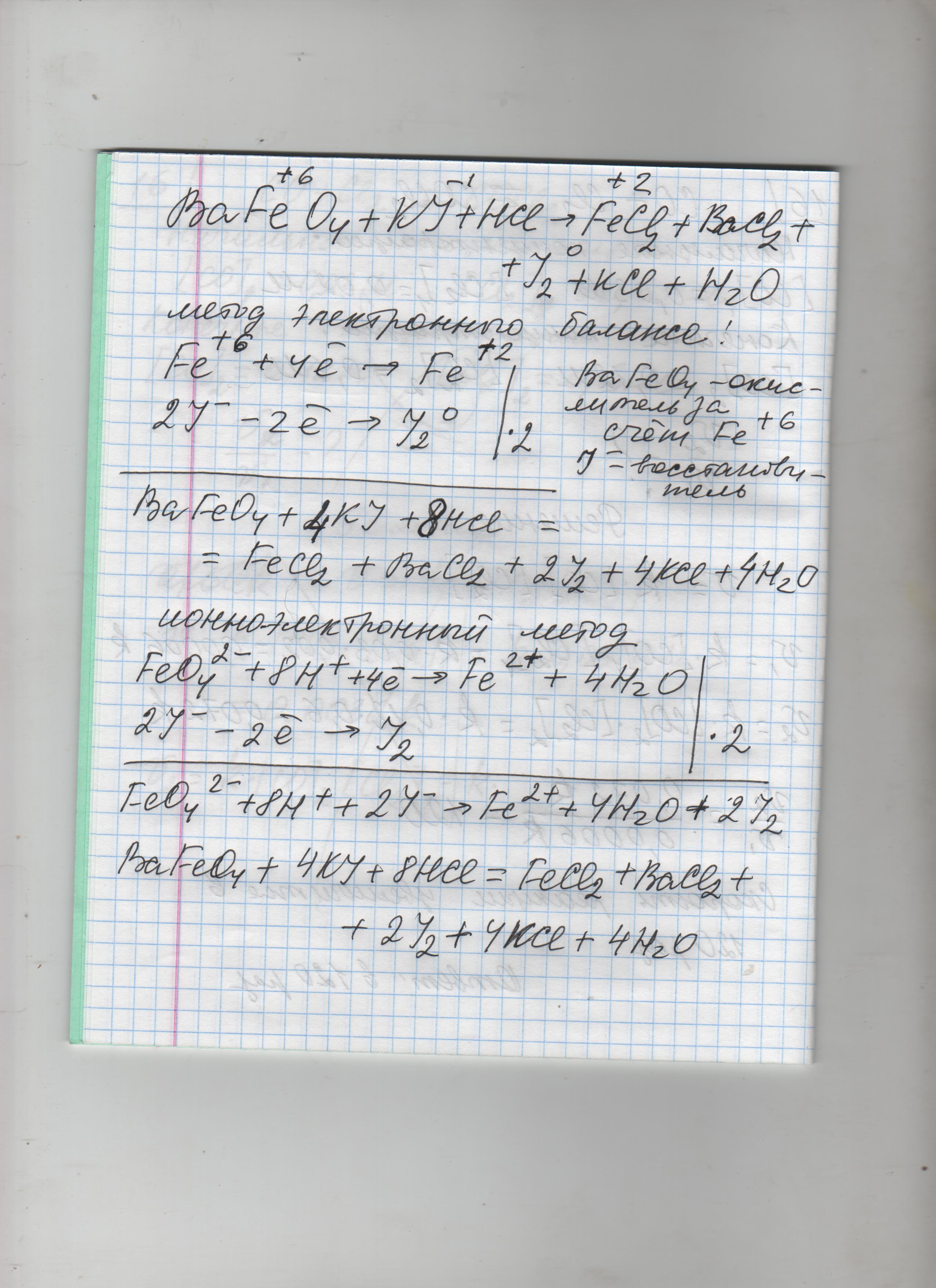 Подберите коэффициенты в уравнении реакции BaFeО4 + KJ + HCl → FeCl2 + BaCl2 + J2 + KCl + H2О двумя методами: ионно-электронным и балансовым. Укажите окислитель и восстановитель.