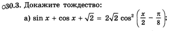 На первом изображении пример доказательства тождества из Мордковича, профильный уровень за 10 класс (сам пример на втором скриншоте.) Объясните, каким образом во втором действии с конца sin(3pi/8 + x/2) стал cos(x/2 - pi/8)?