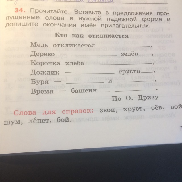 34. Прочитайте. Вставьте в предложения пропущенные слова в нужной падёжной форме и допишите окончания имён прилагательных