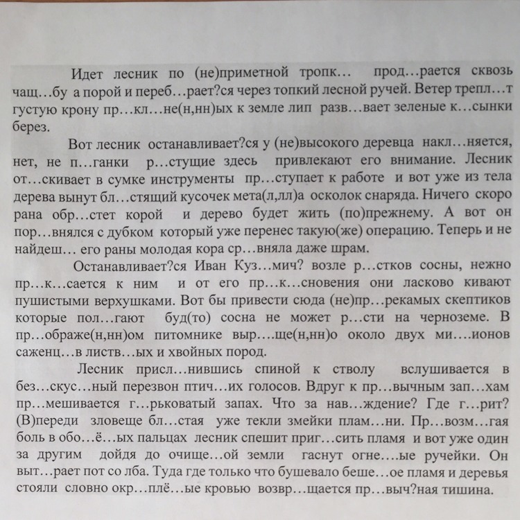 С собой только сумка с НЕмудреным инструментом да пара рук, а впереди зловеще блИстают, и уже тЕкут змейки пламЕни. ЛЕсник очИщает землю от сухих листьев, прЕвозмогает боль в обоЖЖенных пальцах, и спЕшит погАсить пламя. И вот, огнеННые ручейки дОходят до очищенной земли, и гаснут. Туда, где только что бушЕвало бешеНое пламя, где деревья стояли, как будто окрОпленные кровью, возврАщается мгла.