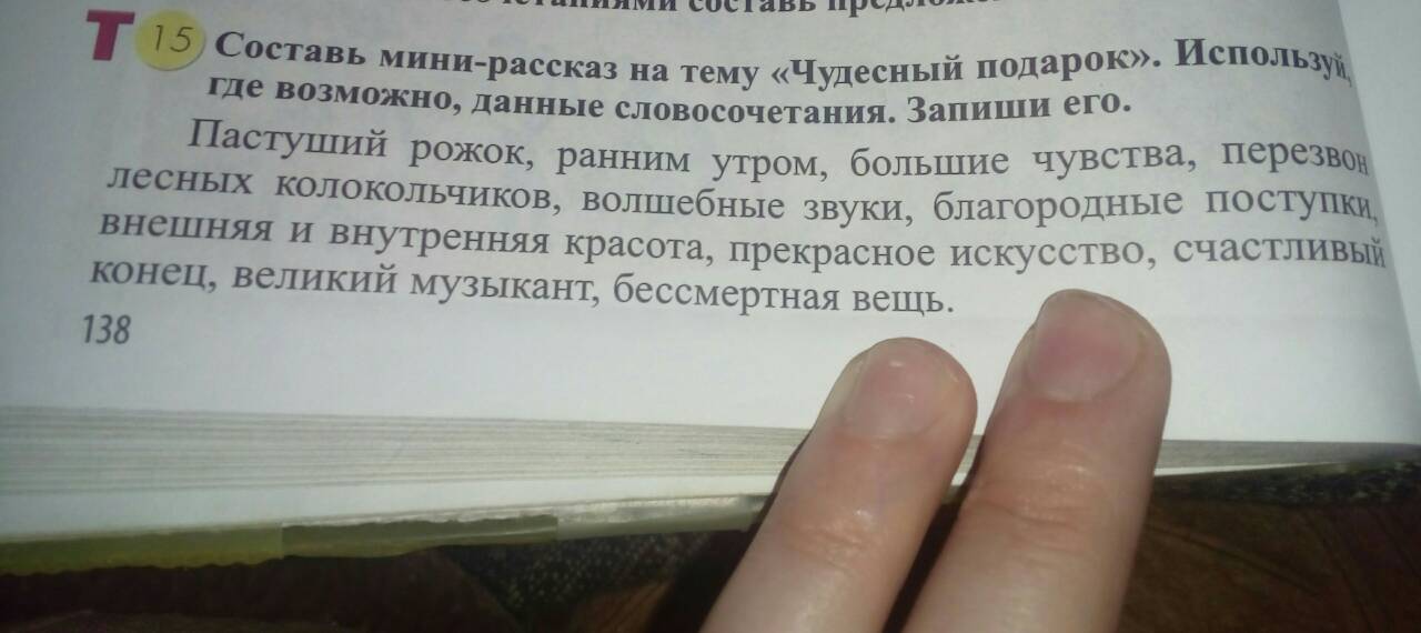 ранним утром я у себя под подушкой чудесный подарок. Там был пастуший рожок. Я умылась, позавтракала, расчесалась и побежала на улицу к перезвону лесных колокольчиков. Я начала играть из рожка донасились волшебные звуки, и я почувствовала себя великим мызыкантом. Сразу захотелось делать благородные поступки. Музыка это безсмертная вещь