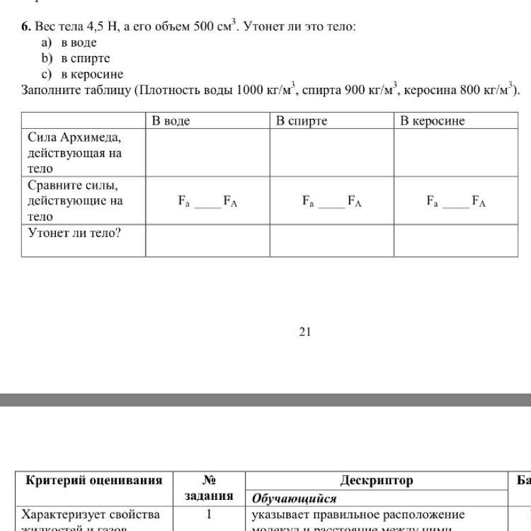 Архимедова сила. Таблица