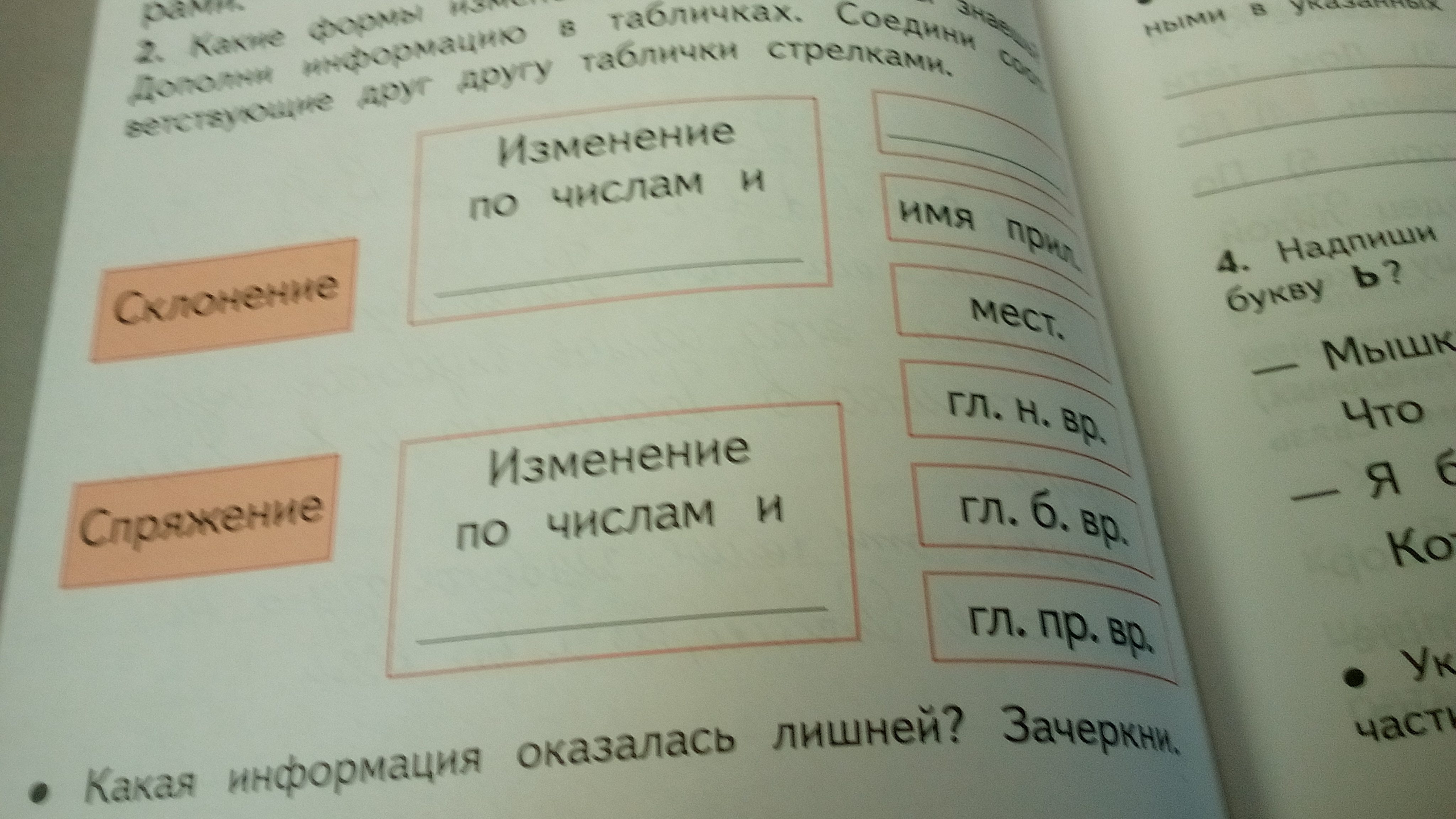 Какие формы изменения частей речи ты знаешь? Дополни информацию в таблички. Соединить соответствующие друг другу таблички стрелками.