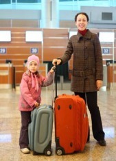 In this picture we see a women and a girl. Maybe they are relatives. As we see they are in airport. And they are going abroad. A women and a girl are very happy. Maybe they are going to visit other their relatives or to see another country. The weather is cold, because they are in winter clothes. Or maybe they are going to hot country. They are with big suitcases. That is why I do not think that they are going for one week.