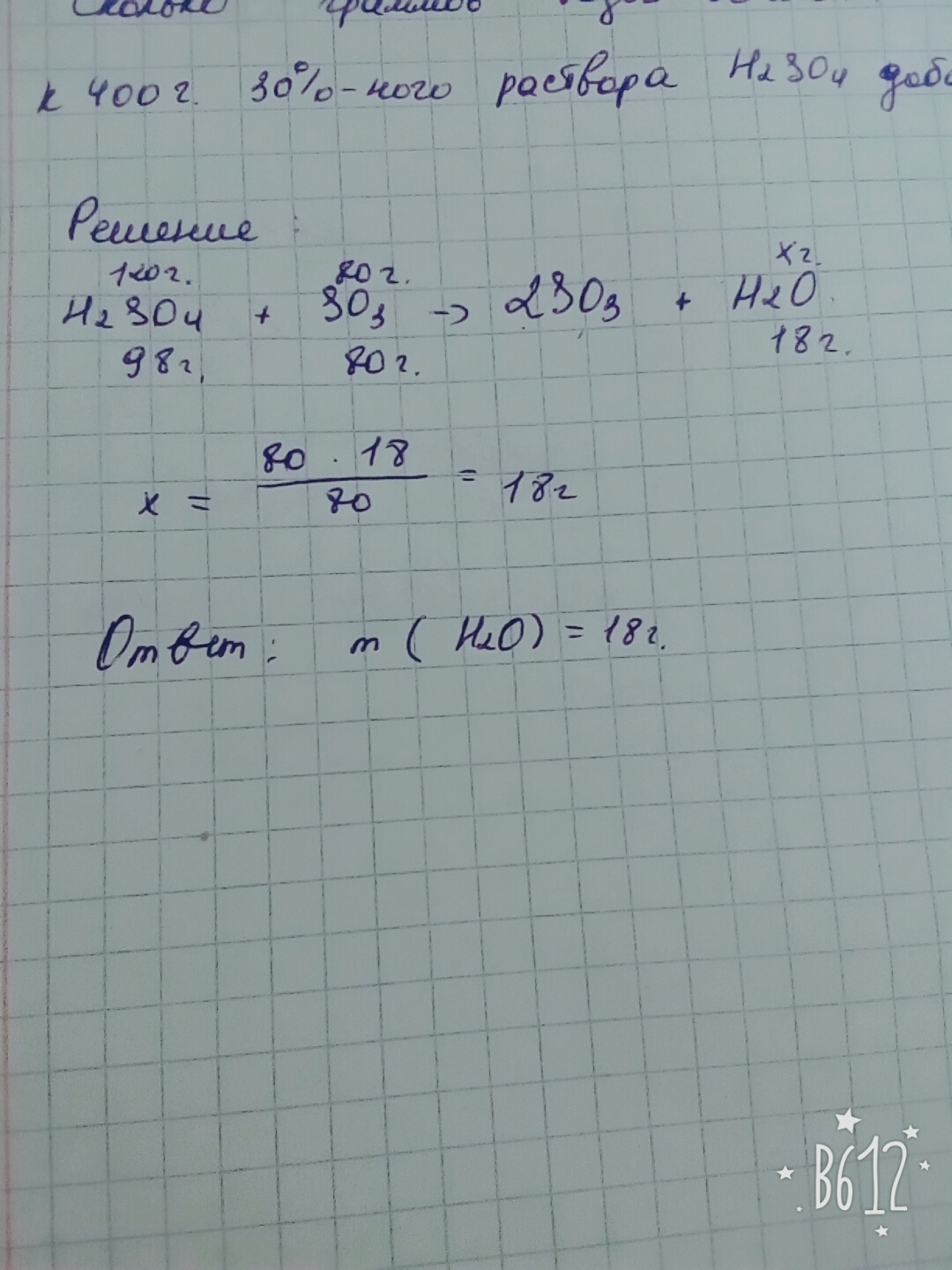 сколько граммов воды останется в растворе если к 400 г 30% -ного раствора H2SO4 добавить 80г SO3? Mr(SO3)=80 Mr(H2O)=18