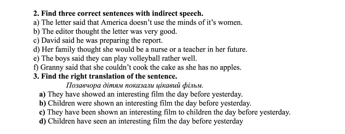 with indirect speech : c) e) f)
