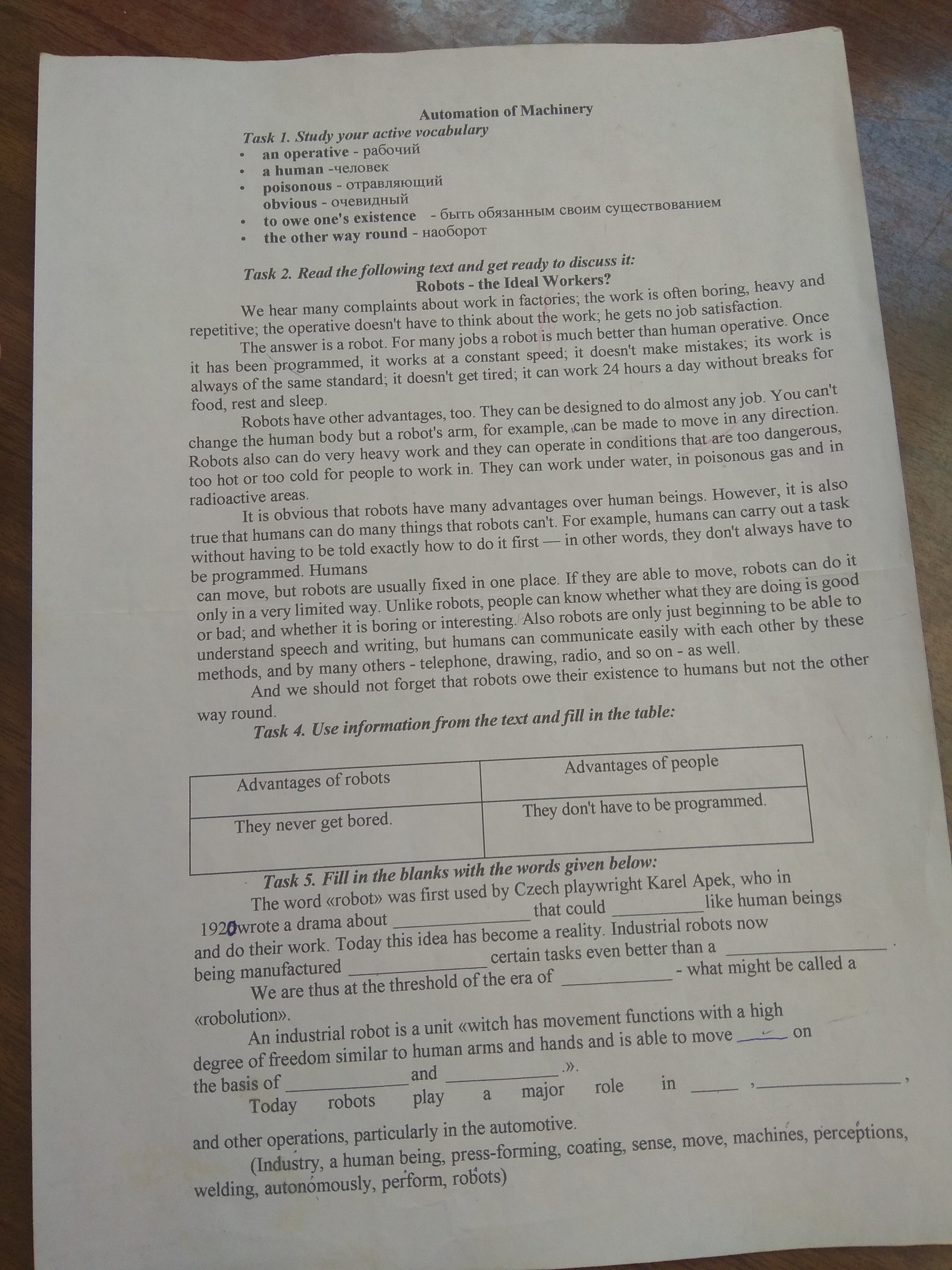 Advantages of robots — it works at a constant speed; it doesn't make mistakes; its work is always of the same standard; it doesn't get tired; it can work 24 hours a day; they can be designed to do almost any job.