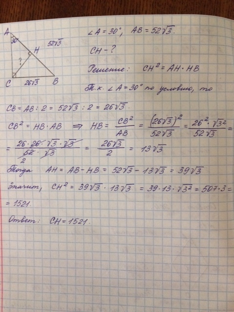 В треугольнике ABC угол с равен 90, а угол a равен 30 градусов, AB равна 52 корня из 3.Найдите высоту CH. Срочно!!!