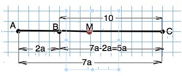 Точное условие задачи: На отрезке АС отмечена точка В. Известно что АВ:АС=2:7, а ВС=10 см. а) Найдите длины отрезков АВ и АС. б) Найдите расстояние от точки В до середины отрезка АС.