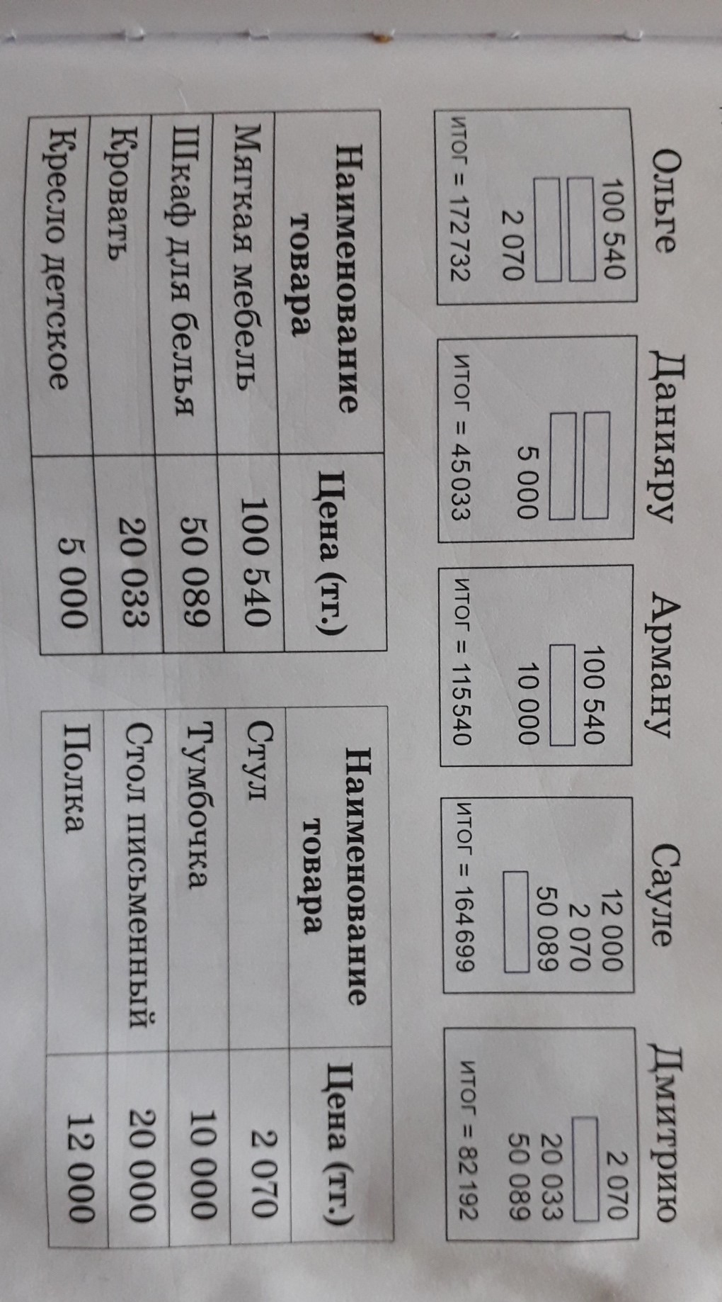 родители купили детям мягкую мебель на определенную сумму Определи по чекам какой комплект мебели купили каждому ребёнку