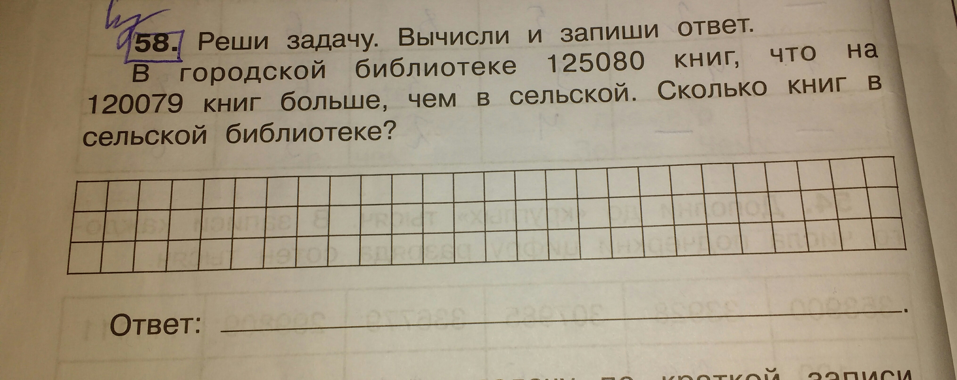 В городской библиотеке 125080 книг, что на 120079 книг больше, чем в сельской. сколько книг в сельской библиотеке?