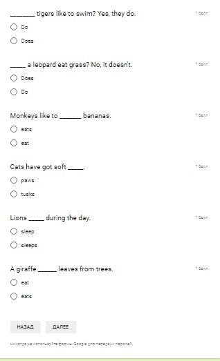 1 have 2 stripes 3 dog 4 sings 5 eyes 6 pet 7 feathers 8 long 9 has 10 black 11 do 12 does 13 eat 14 paws 15 sleep 16 eat