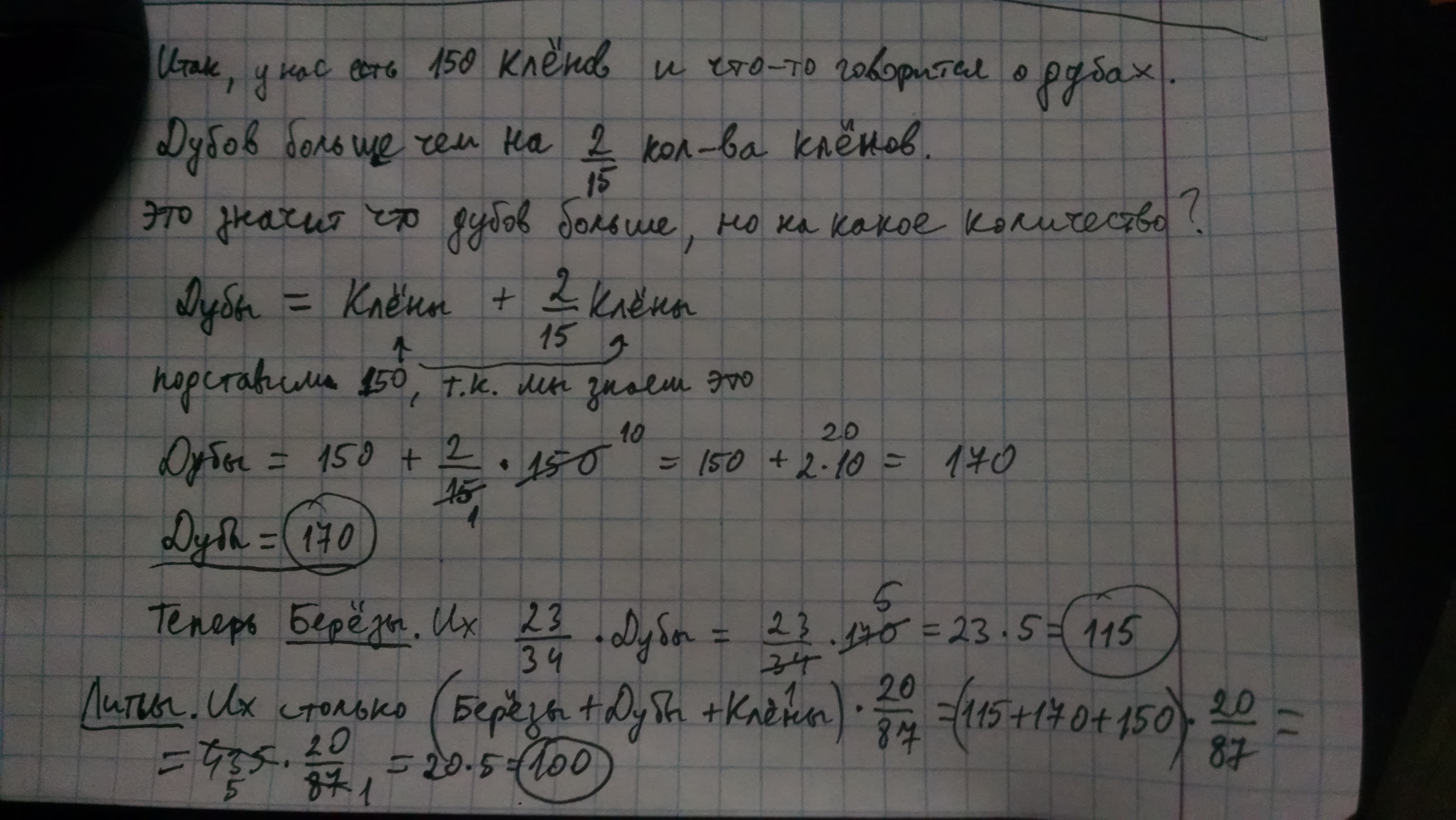 Объясните, пожалуйста, задачу! ("/"- черта дроби) В парке растет 150 кленов, дубов больше на 2/15 кол-ва кленов, березы составляют 23/34 кол-ва дубов, а липы - 20/87 общего кол-ва кленов, дубов и берез. Сколько всего указанных деревьев растет в парке? ЗАРАНЕЕ СПАСИБО! <3