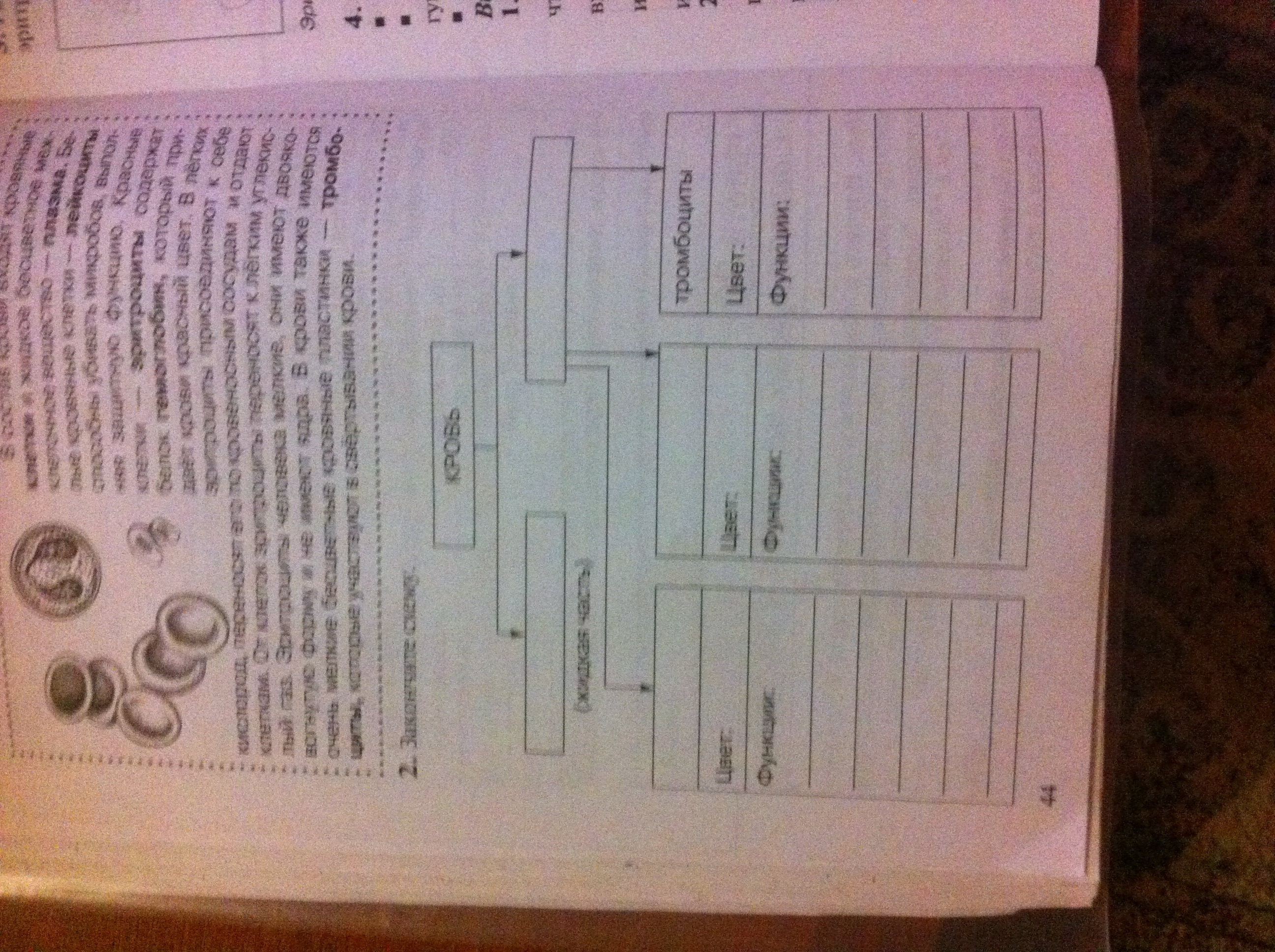 У эритроцитов:цвет:красный. Функции:транспортирует кислород к тканям и углекислый газ к лёгким.