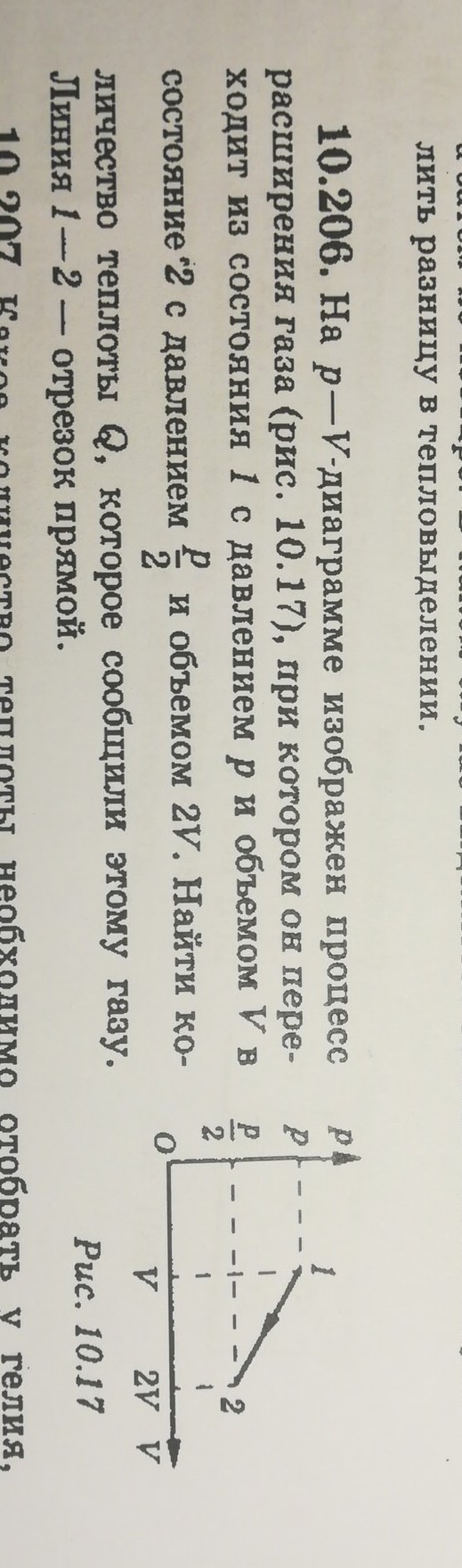 На PV-диаграмме изображен процесс расширения газа, при котором он переходит из состояния 1 с давлением P и объемом V в состояние 2 с давлением p/2 и объемом 2V. Найти количество теплоты, которое сообщили этому газу. Линия 1-2 - отрезок прямой.