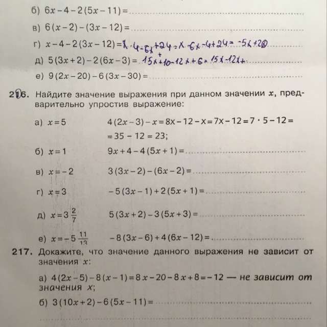 2)Упростите буквенное выражение: Например: 4(x+5)-2x=4x+20-2x=(4-2)x+20=2x+20; а)6x-4-2(5x-11)= б)6(x-2)-(3x-12)= в)9(2x-20)-6(3x-30)=