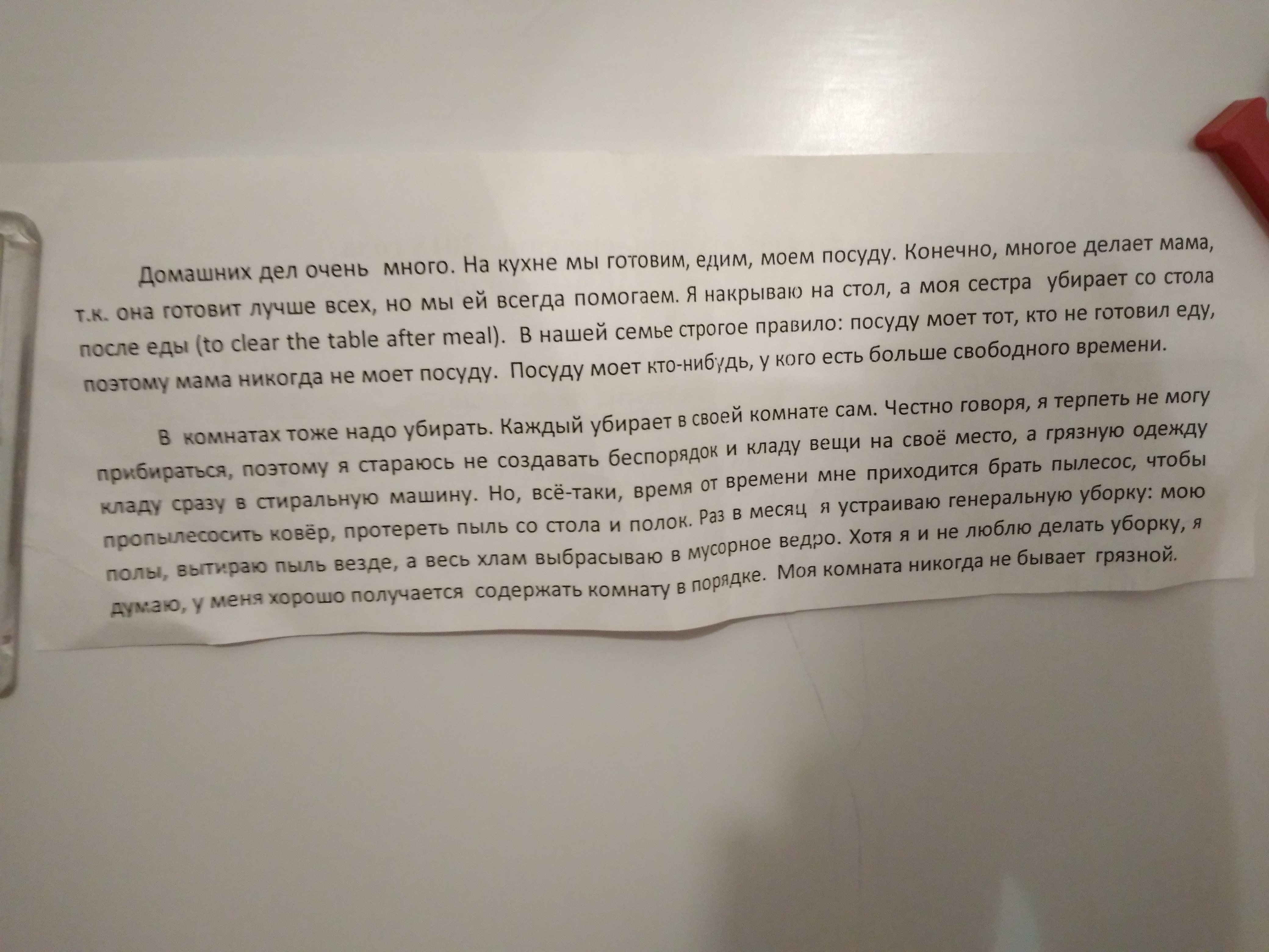 household chores very much. In the kitchen we cook, eat, wash dishes. Of course, Mom does a lot, because she cooks best, but we always help her. I lay the table, and my sister cleans the table after a meal. In our family, the strict rule is that the dishes are cleaned by those who do not cooked food, so mom never cleans the dishes. The dishwasher is washed by someone who has more free time. in the rooms, too, it is necessary to clean every one in his room himself. Honestly, I hate to clean up, so I try not to create a mess and put things on my own place, and put dirty clothes directly in the washing machine. But, nevertheless, from time to time to me You have to take a vacuum cleaner to vacuum the carpet, wipe the dust off the table and shelves. Once a month I I arrange the general cleaning of my floors, wiping dust everywhere, and all the rubbish in the trash can. Although I I do not like to do cleaning, I My room is never dirty. I think I'm feeling well keep the room in order.