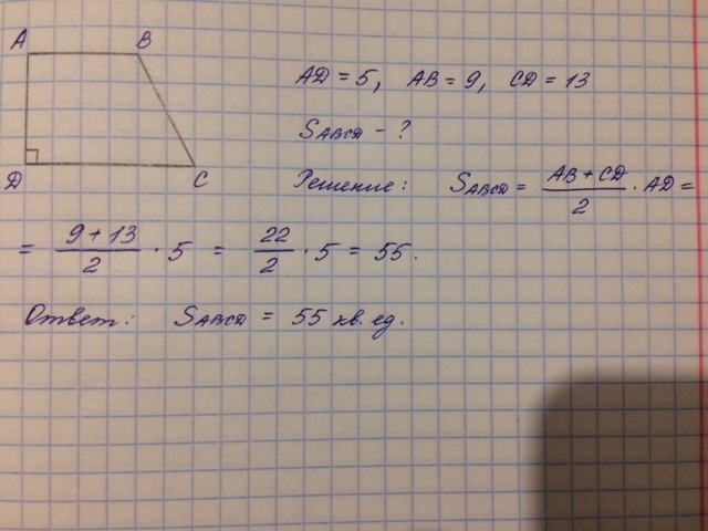 Найдите площадь прямоугольной трапеции, если ее меньшая боковая сторона равна 5, а основания равны 9 и 13.