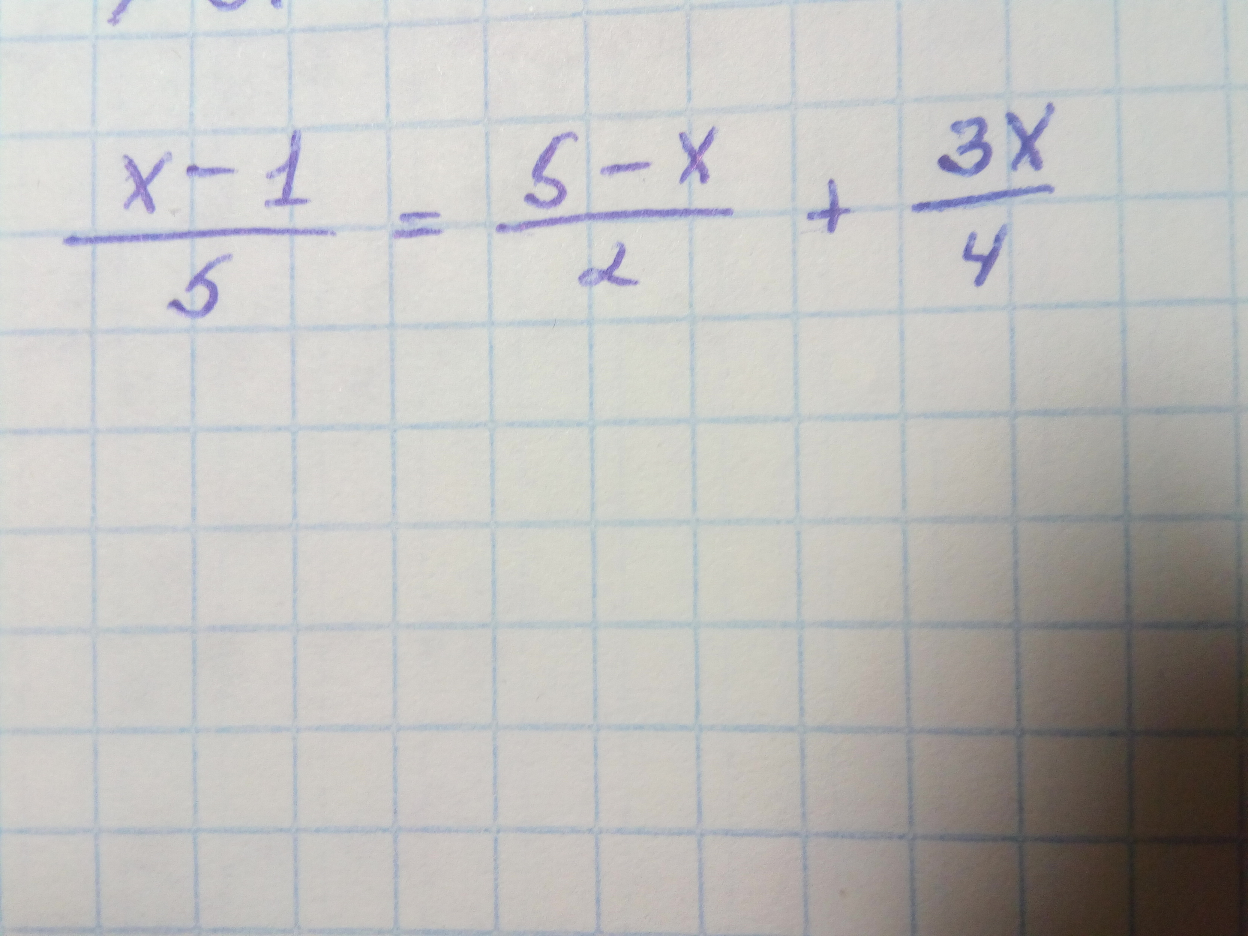 x-1,делённое на 5=5-x,делённое на 2+3x,делённое на 4.Пожалуйста помогите решить уравнение.