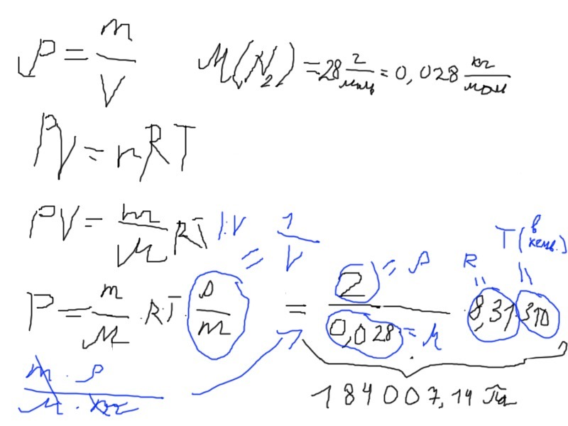 Решим эту задачу через уравнение Мендлеева-Клайперона в интегральной форме: P*V=n*R*T. Написал все в прикрепленном файле, синем - действия по упрощению выражений. Ответ: Давление равно 184007,14 Па = 184кПа