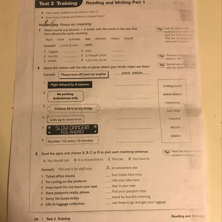 2. 1) airport 2) hospital 3) station 4) underground 5) motorway 6) bus stop