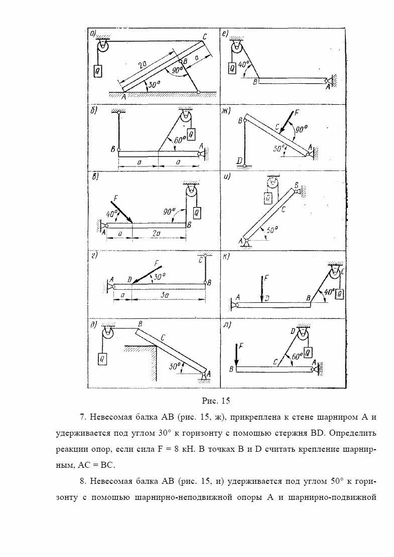 Невесомая балка АВ (рис. 15 ж) прикреплена к стене шарниром А и удерживается под углом 30 градусов к горизонту с помощью