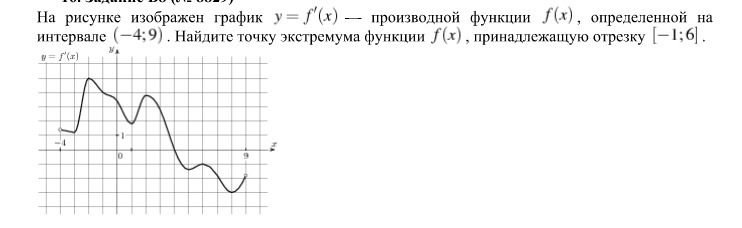 Если производная в какой- то точке равна нулю и при прохождении через эту точку меняет знак с плюса на минус, или с минуса на плюс, то это точка экстремума. На отрезке [- 1 , 6] график пересекает ось абсцисс в точке 4 и при прохождении через эту точку меняет знак с плюса на минус.