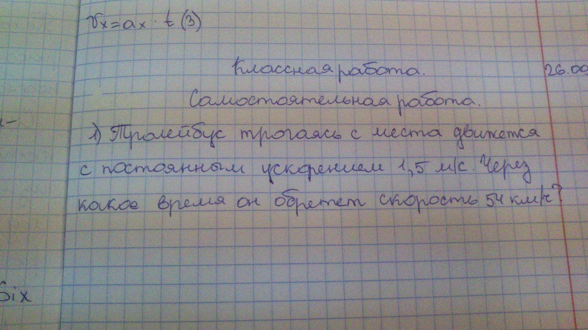 Троллейбус трогаясь с места движется с постоянным ускорением 1.5 м/с. Через какое время он наберет скорость 54 км/ч?